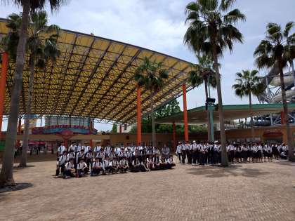 ナガシマスパーランドのゲート前で学級写真を撮影し、入場します。
