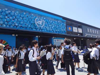 生徒たちが12時30分に指定されたパビリオン前に集まっています。