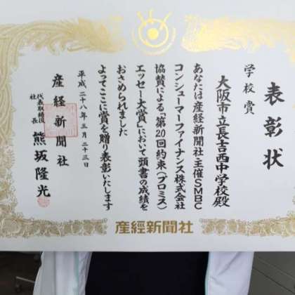 「第20回約束(プロミス)エッセー大賞」の学校賞を受賞し(全国の中学校で2校)、その伝達を行いました。