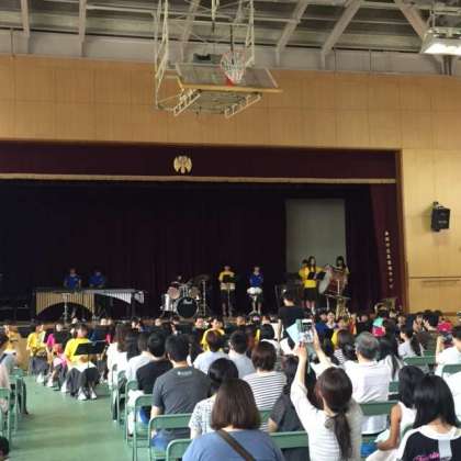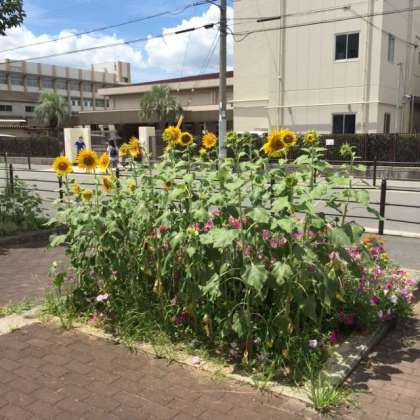 夏休み恒例の吹奏楽のアンサンブルコンサートが暑い体育館で実施されました。中身も熱いものとなりました。学校前の公園の一部をお借りしてガーデニング部が育てているヒマワリもまさに花を添えました。