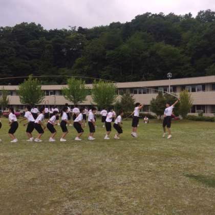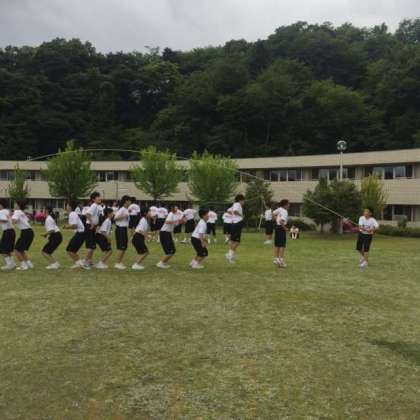 カッター訓練の裏メニューは大縄跳びです。さあ、何回跳べるかな。