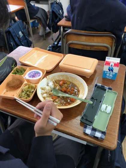 給食2日目、今日の献立はカツカレーでした。まだ、新しいクラスに慣れていないせいか、静かな食事風景でした。