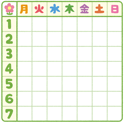 | 日 | 月 | 火 | 水 | 木 | 金 | 土 |