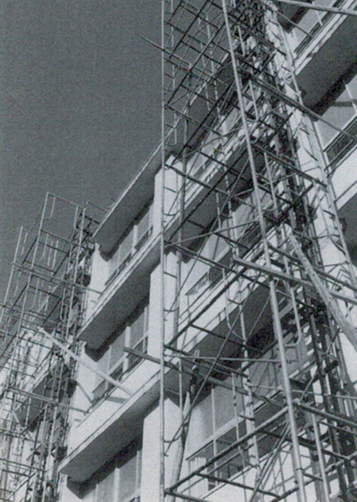 西校舎北校舎接続部、壁面モルタル施工工事 |
