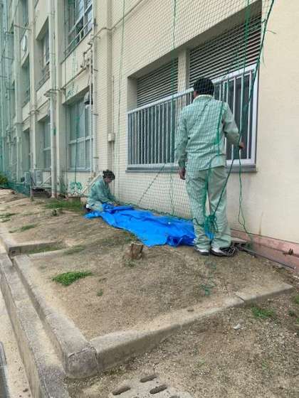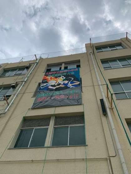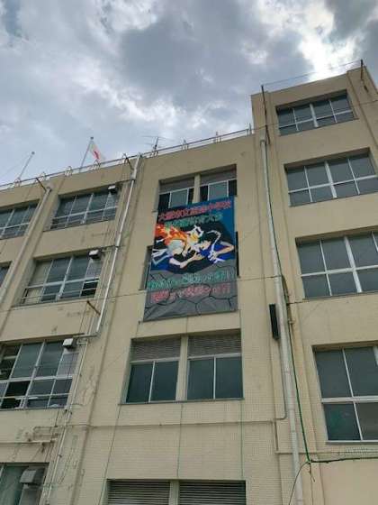 美術部が製作した体育大会の垂れ幕を管理作業員さんが設置してくれています。