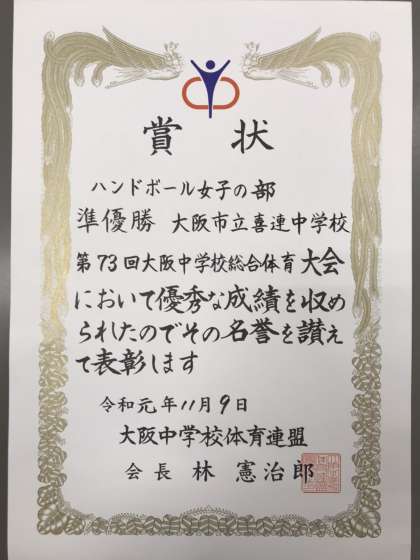 11月9日(土)堺市家原大池体育館で行われた大阪中学校総合体育大会(大阪府秋季大会)において、女子ハンドボール部が準優勝という成績を収めました。