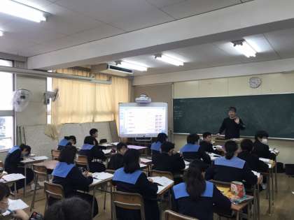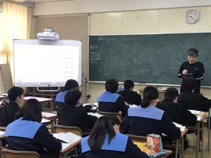 1年生の英語において、購入したインタラクティブプロジェクタースクリーンを活用している授業の様子を記載しています。