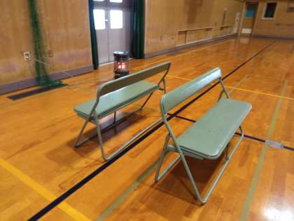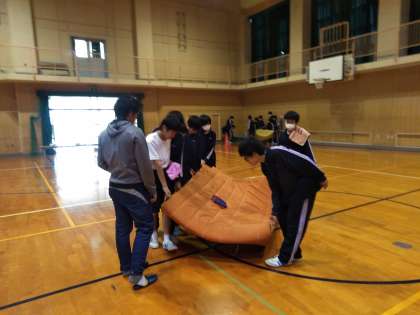 細い道に見立てた道を目をタオルで覆って、補助を受けながら、進みます。