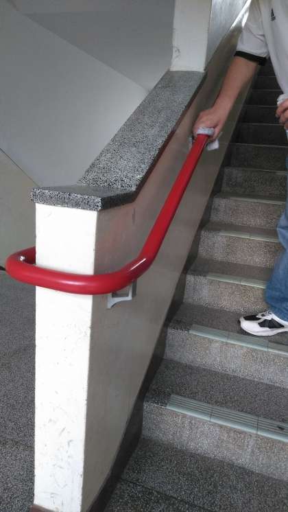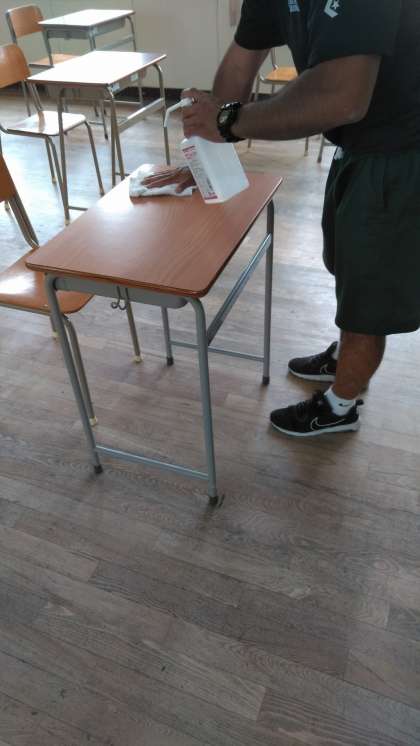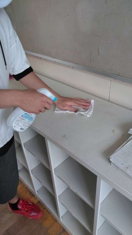 感染防止のため、教室の机や椅子、階段の手すり、トイレ等を中心に、グループ入れ替え時に消毒作業を行っています。