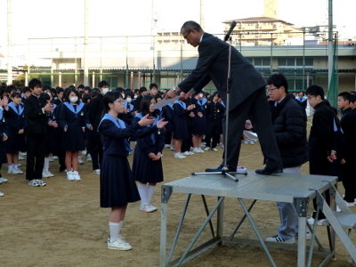 12月8日(月)、美術部部長の小倉さゆりさん、同副部長の岡部志音さんと、喜連中学校・女子キックベースボールチームの表彰が行われました。同チームは、バレーボール部・バドミントン部・バスケットボール部・ハンドボール部・テニス部・剣道部からの選抜メンバーで構成されています。