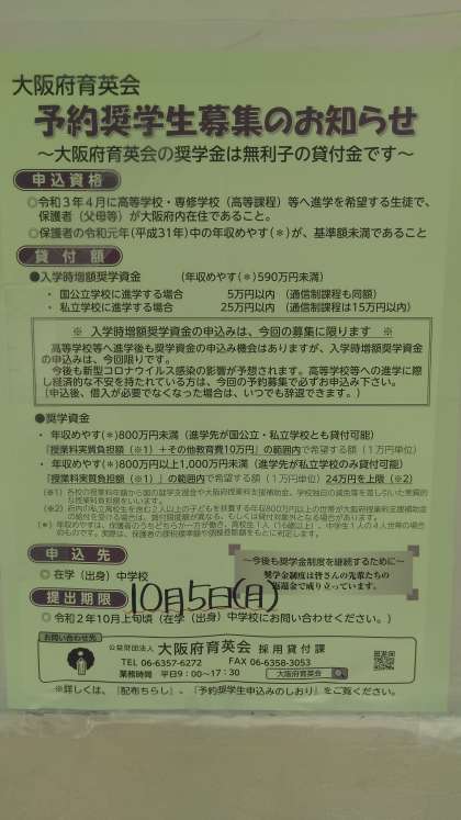 大阪府育英会の奨学金の案内です。東館2Fの廊下に掲示してあります。