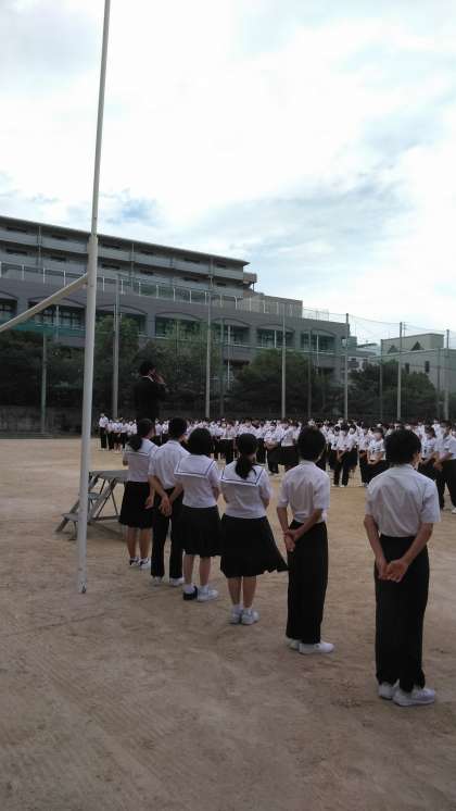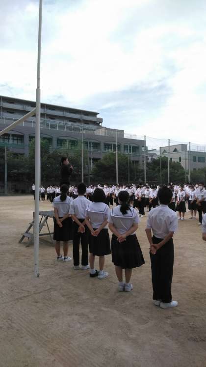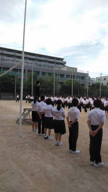 本日、運動場で全校集会を行いました。教育実習が終了しますので、教育実習生一人ひとりが挨拶を行いました。