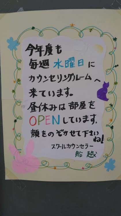 本日スクールカウンセラーの先生が来られます。よろしくお願いいたします。