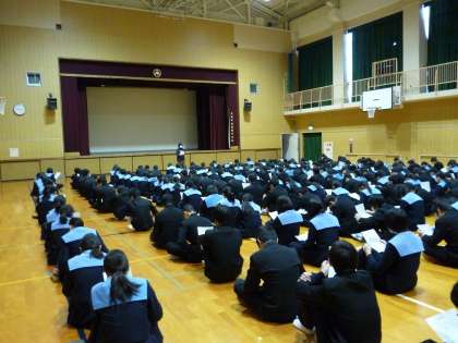 1月23日(金)1限目、体育館において3年生の私立高校出願事前指導を行いました。