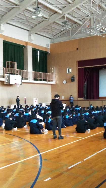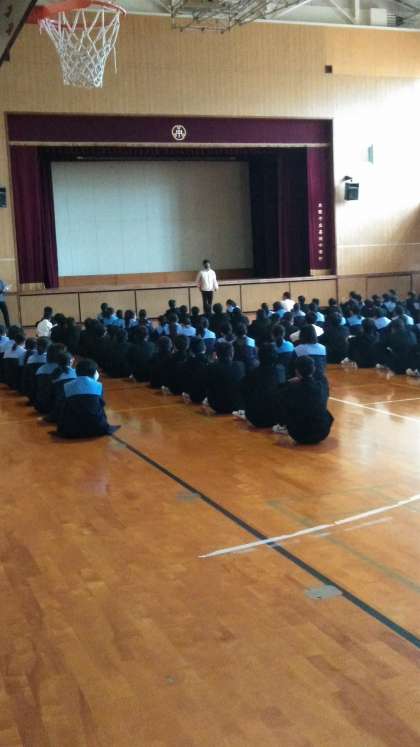水曜日は1年生の学年集会の日です。生徒のみなさんは真剣に話を聞いていました。