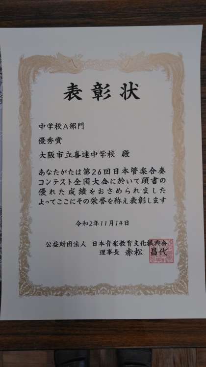 本校吹奏楽部は、第26回日本管楽合奏コンテスト全国大会に於いて「優秀賞」という優れた成績をおさめました。