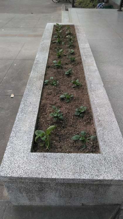 玄関前の花壇に、管理作業員さんが新しい花の苗を植えてくれました。