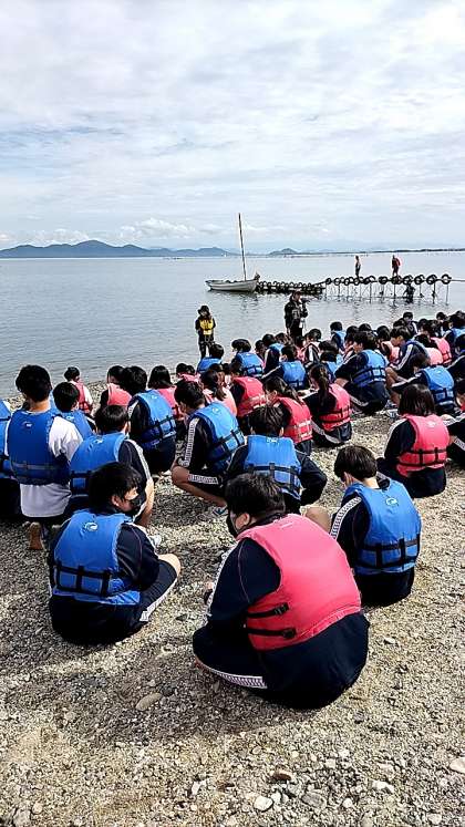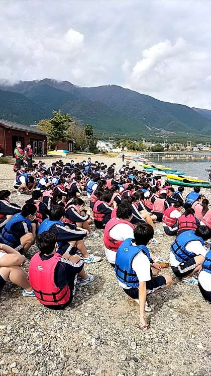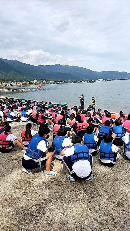 生徒のみなさんは、インストラクターの方から、カヤックレースの説明を聞いています。