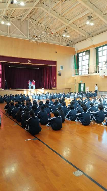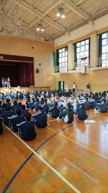 2限目、体育館で、車いす・アイマスクに関しての説明を聞いています。