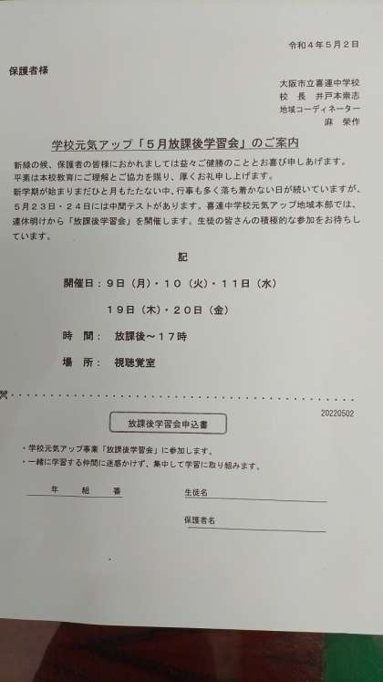 「5月放課後学習会」の案内と申込書です。