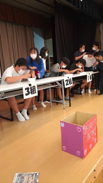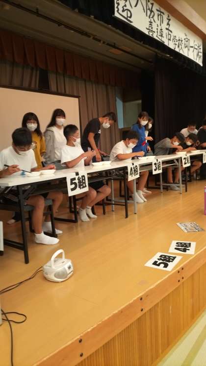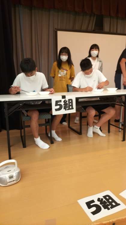クラスの代表者が、それぞれ違った物を使ってあずき移しを行っています。