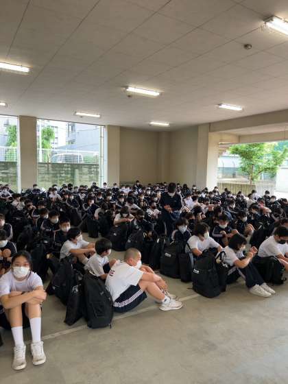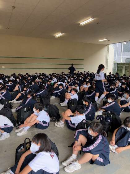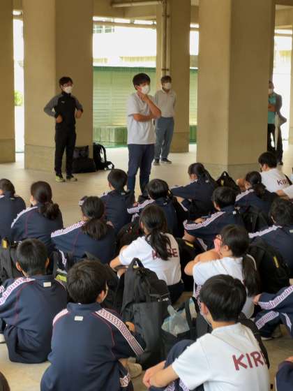 ピロティ広場にて健康観察、来週の予定などを説明しています。