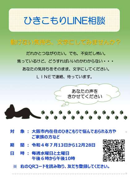 健康局こころの健康センターでは、相談支援を中心にひきこもりに関する啓発や情報発信を行うとともに、関係部局とも連携してひきこもり支援に取り組んでおられ、この度、「LINEを活用したひきこもり相談」を試行実施されることとなりました。
