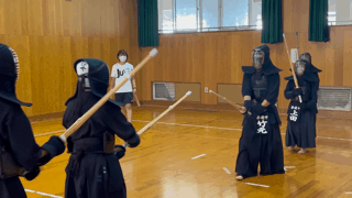 剣道部が暑いなか防具をつけて素早い動きで連続応じ技の練習をしています。
