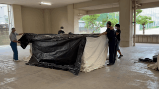 煙体験のテントを区役所、消防、本校の職員が一緒に設営しています。