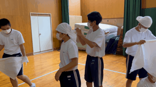 包帯法の体験です。難しそうですが一生懸命トライしてます。