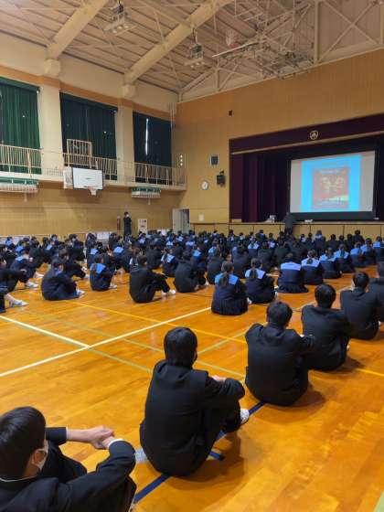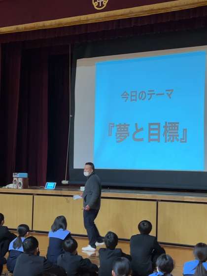 本日、5時間目に体育館で2年生の人権教育が行われました。テーマは夢と目標で太田先生が映像などを使いながら講義を進めてくれました。