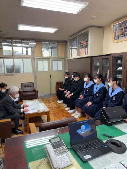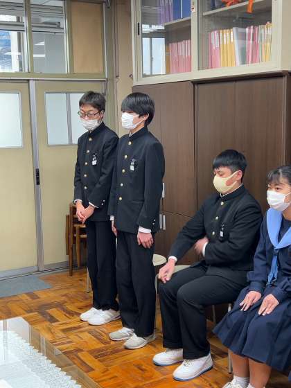 昨日に引き続き、本日6時間目に校長面接が実施されました。本日は3年2組の生徒の皆さんが、校長室で面接練習を実施しました。皆さん緊張した面持ちでしたが、待っている間も姿勢正しく構えて臨んでいました。