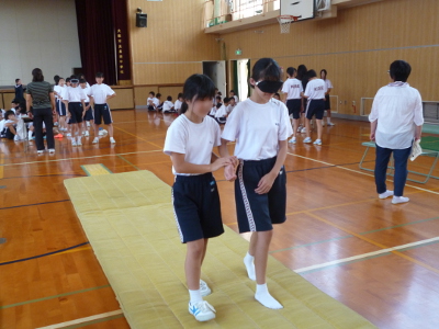 8月28日(金)、1年生は人権教育として、2限目に体育館で乙武さん主演の「波乱万丈」のDVDを鑑賞したあと、3、4限目を使って、車イス、アイマスクの体験を実施しました。