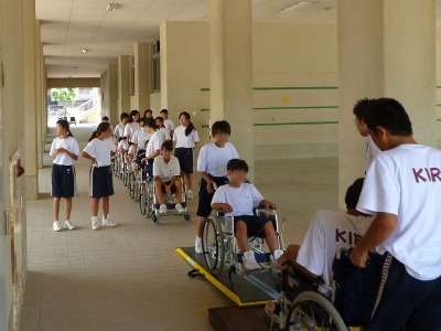 大阪市立心身障がい者リハビリセンーから車イス28台をおかりして、スタッフの方々から説明を聞いたあと、グループに分かれて体験しました。