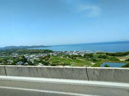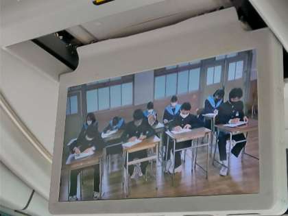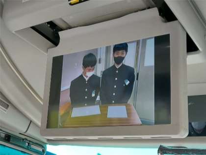バスのなかでは、レクリエーション係の生徒が作ったDVD映像が上映されています。