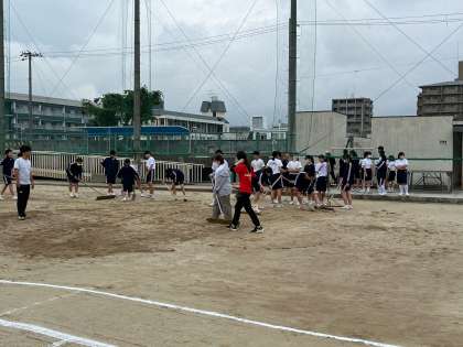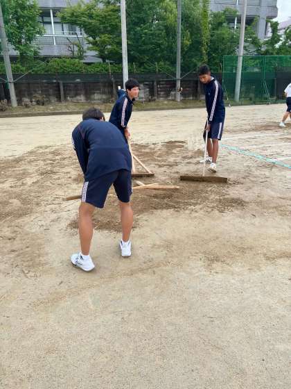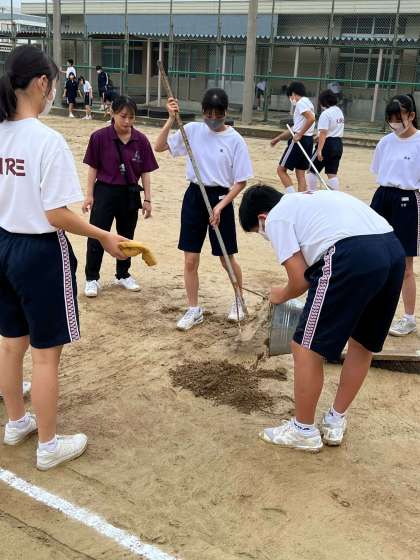 係の生徒、教職員が総出でグラウンドを整備しています。
