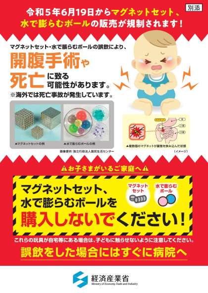 強力な磁力を有する複数個の磁石を組み合わせて使用するいわゆるマグネットセットや、水を吸収することで大きく膨らむ吸水性の玩具は、6 月19 日より販売できなくなりました。子供が同製品に触らないように御留意いただくことが重要であり、また、仮に同製品が販売されていたとしても、購入されないよう御注意願います。