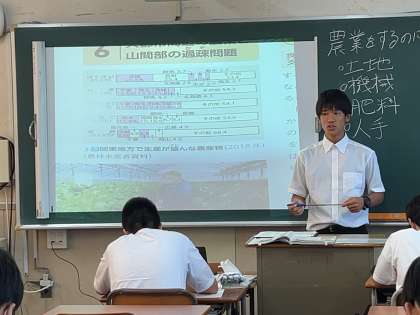2時間目、2-3で教育実習生の研究授業が行われました。社会科の授業で「東京大都市圏周辺の農業地域と東京大都市圏との結びつきと山間部の過疎問題について理解しよう」というめあてで、過疎の問題を解決するためにはどうすれば良いのか、グループで話し合いながら考えていました。