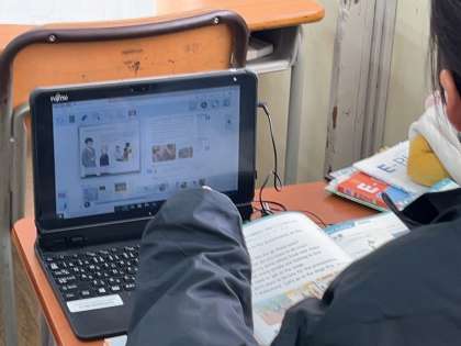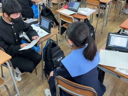 端末を使ってリスニングや発音のチェックが行われました。