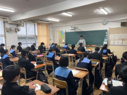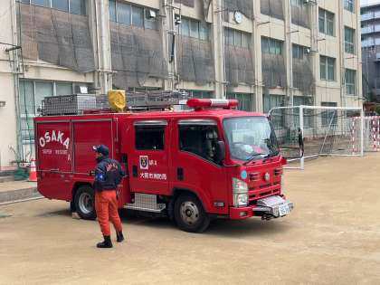 地震後に火災を想定した訓練の予定でしたが、雨が降っていたため、地震後津波発生を想定した訓練に切り替えて行いました。8月に大阪800万人訓練に合わせた避難訓練で津波避難の訓練を行っていたので、生徒たちもスムーズ動いて訓練に取り組んでいました。消防隊の方からは火災が起きた時の注意事項などをお話ししていただきました。