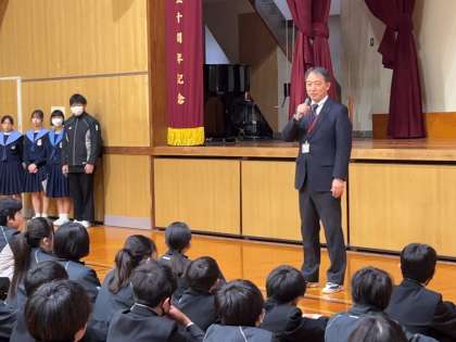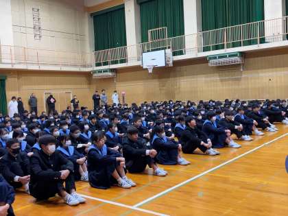 全校集会が行われ、校長先生から学校給食についてお話がありました。1/24〜1/30は全国学校給食週間として設定されています。日本で初めての学校給食は、明治22年に山形県の小学校で貧困児童を対象に無料で提供され学校給食の起源となりました。当時はおにぎりと塩鮭という質素なものでしたが、今ではたくさんのメニューが増えています。震災で満足に食べるものが無い状況で生活している人もいます。今一度、食べ物があることの喜びに感謝して、給食を食べるようにしていきましょう。
