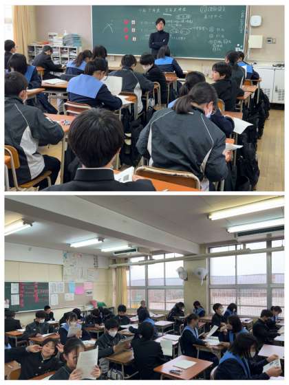1.2年生の学年末テスト2日目は、社会・数学と1年美術、2年音楽です。明日は最終日で、理科、保健体育、技術家庭科が行われます。