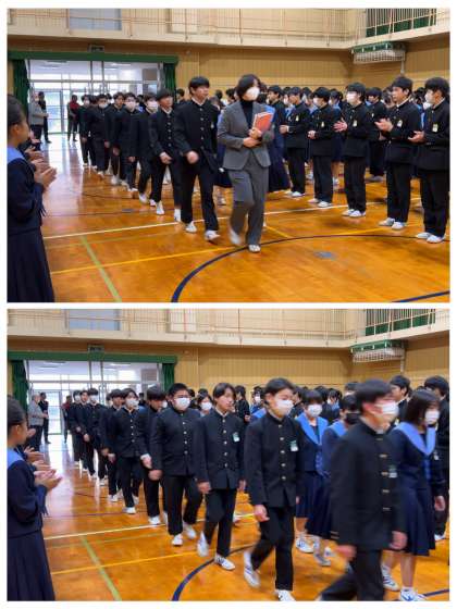 在校生代表と3年生代表がそれぞれ言葉を述べ、2年生からコサージュの贈呈が行われました。来週、3月13日(水)にいよいよ卒業式を迎えます。残りわずかとなった中学校生活を大切に過ごしてください。