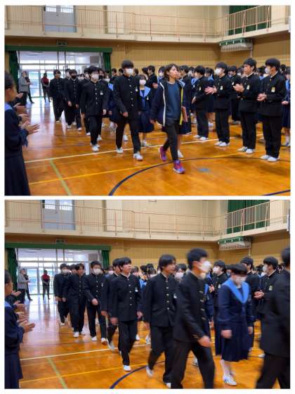 本日、3年生を送る会が行われました。小雨が降る天候でしたが、体育館では厳粛な雰囲気で在校生が迎え、3年生が落ち着いた表情で入場しました。