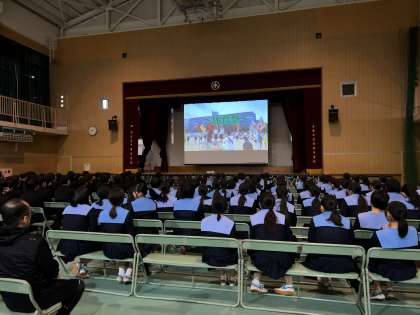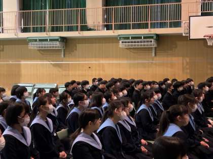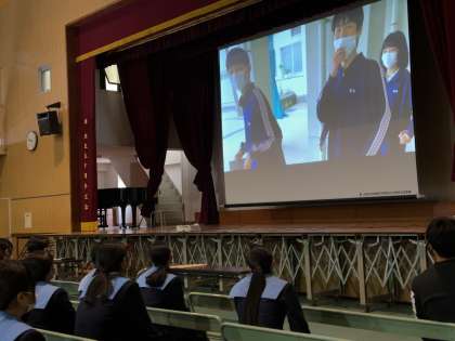 3年生の学年集会が行われ、各先生方のお話の後に3年間のメモリアルムービーが披露され、生徒のみなさんも懐かしそうに中学校生活を振り返っていました。