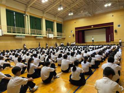 全校集会が行われました。校長先生から本校の生徒が財布を拾って、その財布を落とされた方からお礼の挨拶に来校された話を紹介されました。