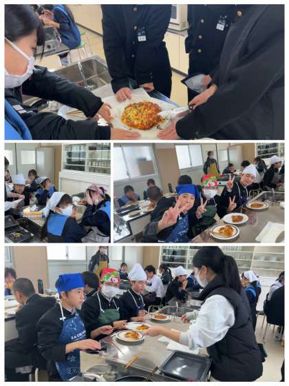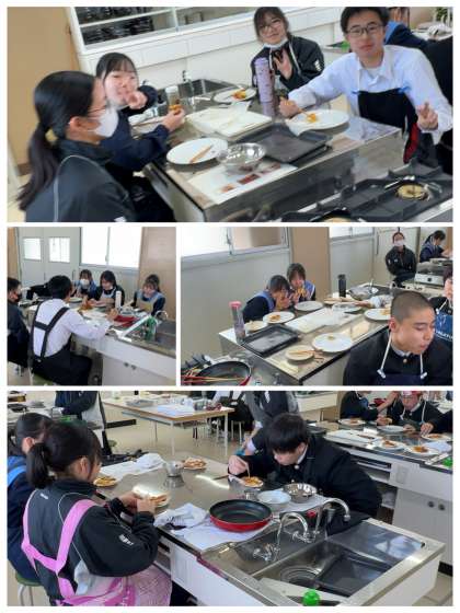 2年4組の調理実習が行われ、班ごとでピザを調理しました。みなさん美味しく召し上がりました。