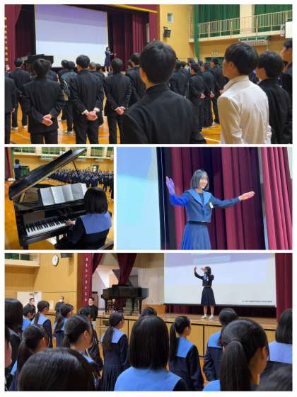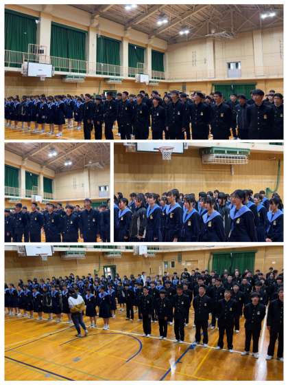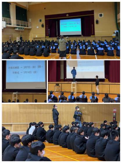5時間目、3年生が体育館で卒業式へ向けた準備として、事前指導と歌の練習が行われました。