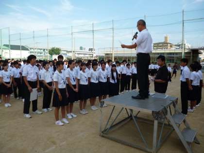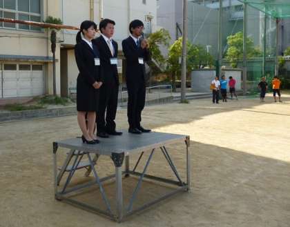9月1日(木)運動場で全校集会を行いました。バドミントン部、奏楽部、柔道個人の表彰式後、本日より教育実習がスタートしますので、実習生の紹介を行いました。