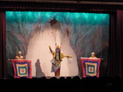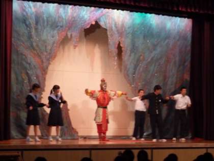 見所として、妖怪の変面技や小猿たちの曲技・雑技、戦いの立ち回り等、もりだくさんの内容で生徒たちも舞台にくぎづけとなりました。